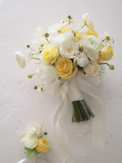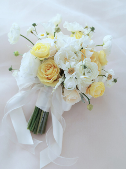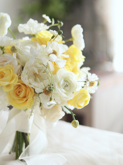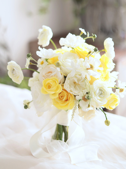 春の日差しのような明るくて元気な雰囲気のクラッチブーケです。